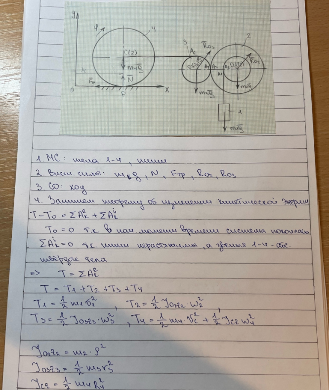 3. Груз 1 массой m1, опускаясь, с помощью нерастяжимой нити приводит во вращение ступенчатый барабан 2 (r2, R2 - радиусы ступеней барабана); радиус инерции барабана относительно его оси вращения – ρ2, m2 - его масса. На большей ступени барабана имеется зубчатое колесо, которое находится в зацеплении о шестерней - барабаном 3 радиусом r3 и массой m3. На барабан 3 намотана нерастяжимая нить, прикреплённая к центру катка 4 массой m4 и радиусом R4, катящегося по горизонтальной направляющей. Нить параллельна горизонтальной плоскости. Коэффициент трения скольжения катка 4 о горизонтальную направляющую равен f. Шестерню-барабан 3 и каток 4 считать однородными цилиндрами.Массами нитей, трением качения, трением в опорах ступенчатого барабана 2 и шестернибарабана 3 пренебречь. В начальный момент система покоилась. Определить: 1) характер качения катка 4; 2) найти уравнения движения катка 4; 3) определить окружную составляющую реакции в зацеплении шестерни 4 и зубчатого колеса барабана 3. В расчетах принять: m4 = 4m1 =4m2 =8m3, m1g = 343 Н, ρ2 = 0,6R2, R2 =2r2 =2r3, R4 = 0,3 м, f = 0,1