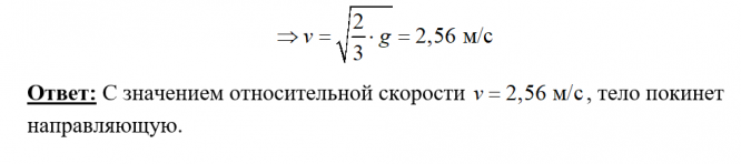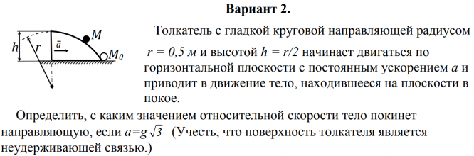 Толкатель с гладкой круговой направляющей радиусом r = 0,5 м и высотой h =r/2 начинает двигаться по горизонтальной плоскости с постоянным ускорением а и приводит в движение тело, находившееся на плоскости в покое. Определить, с каким значением относительной скорости тело покинет направляющую, если а=g*sqrt(3) (Учесть, что поверхность толкателя является неудерживающей связью.) Ответ: 2 , 56 м/с..