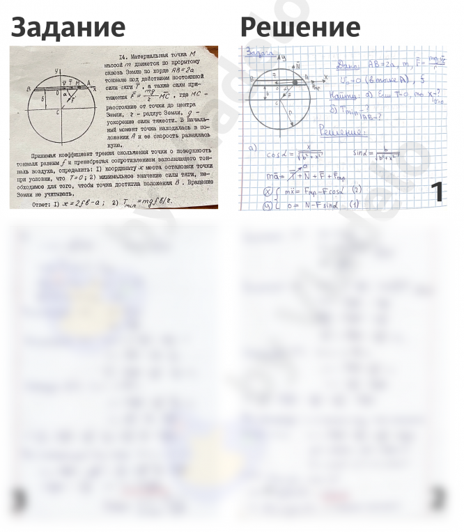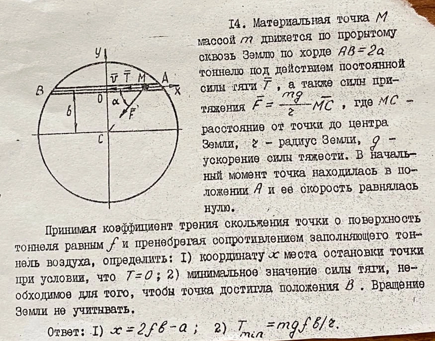 Условие: материальная точка М массой m движется по прорытому сквозь Землю по хорде АВ=2а туннелю под действием постоянной силы тяги Т, а также силы притяжения F = mgMC/r, где где МС — расстояние от точки до центра Земли, r — радиус Земли, g — ускорение силы тяжести. В начальный момент точка находилась в положении А и её скорость равнялась нулю.