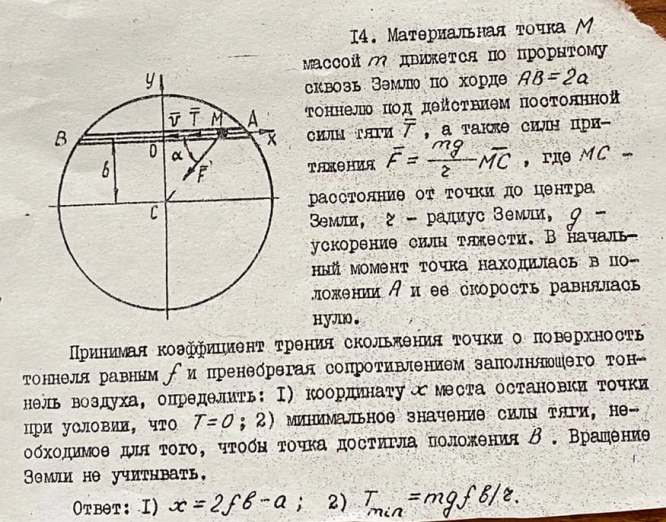 Принимай коэффициент трения скольжения точки о поверхность тоннеля равным f и пренебрегая сопротивлением заполняющего тоннель воздуха, определить 1) координату х место остановки точки при условии, что Т = 0. 2) минимальное значение силы тяги, необходимое для того, чтобы точка достигла положения В. Вращение Земли не учитывать.