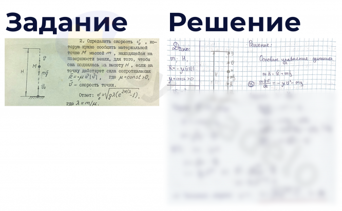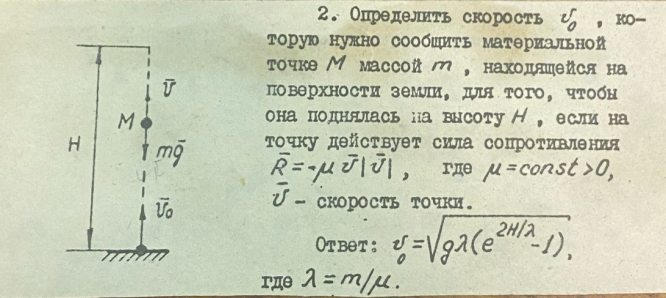 Условие: определить скорость v0, которую нужно сообщить материальной точки М массой m, находящийся на поверхности Земли, для того, что она поднялась на высоту H, если на точку действует силы сопротивления R = -yv2, где y = const > 0, v - скорость точки.