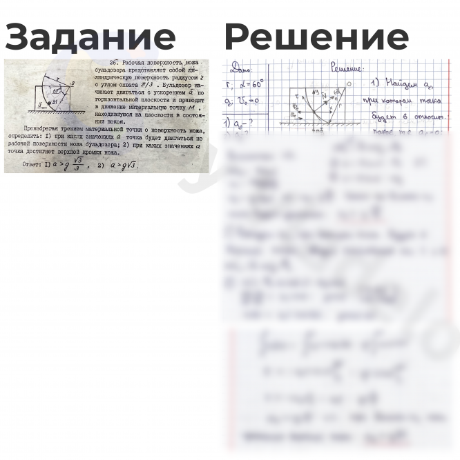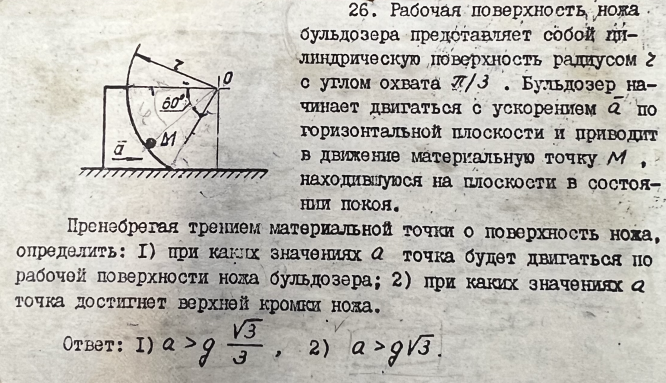 Условие: Рабочая поверхность нока бульдозера предотавляет собой цилиндрическую поверхность радиусом r с углом охвата П/3 . Бульдозер начинает двигаться с ускорением а по горизонтальной плоскости и приводит в движение материальную точку М, находившуюся на плоскости в состоянии покоя. Пренебрегая трением материальной точки о поверхность ножа, определить: I) при каких значениях а точка будет двигаться по рабочей поверхности ножа бульдозера; 2) при каких значениях а точка достигнет верхней кромки ножа.