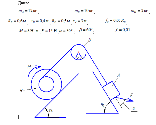 Требуется определить скорость груза А после того, как он пройдет расстояние sA. Нити считать невесомыми и нерастяжимыми, трение в подшипниках не учитывать.