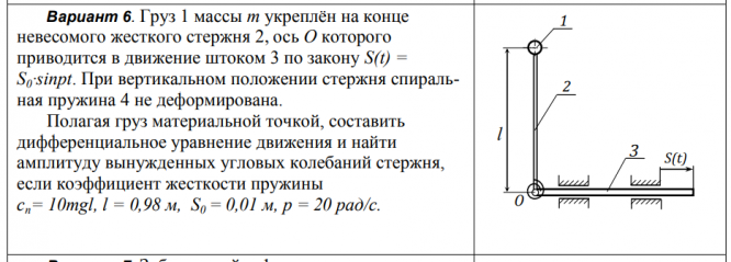 Груз 1 массы m укреплён на конце невесомого жесткого стержня 2, ось O которого приводится в движение штоком 3 по закону S(t) = S0·sinpt. При вертикальном положении стержня спиральная пружина 4 не деформирована. Полагая груз материальной точкой, составить дифференциальное уравнение движения и найти амплитуду вынужденных угловых колебаний стержня, если коэффициент жесткости пружины cп= 10mgl, l = 0,98 м, S0 = 0,01 м, p = 20 рад/с.
