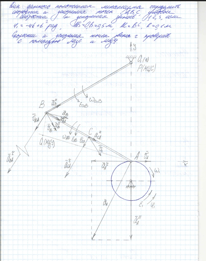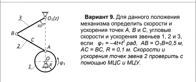 Вариант 9. Для данного положения механизма определить скорости и ускорения точек A, B и C, угловые скорости и ускорения звеньев 1, 2 и 3, если φ1 = –4t+t 2 рад, АВ = O1B=0,5 м, AC = BC, R = 0,1 м. Скорости и ускорения точек звена 2 проверить с помощью МЦС и МЦУ.