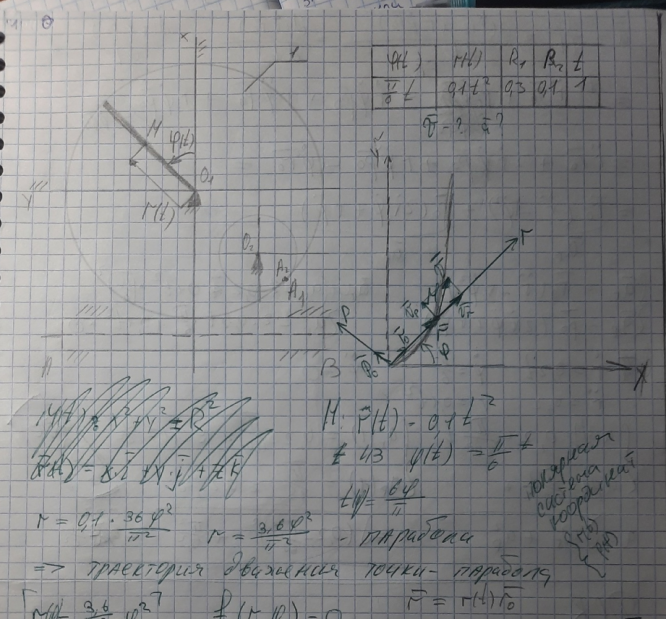 6) найти радиальные и трансверсальные составляющие скорости и ускорения точки M. Начало полярной системы координат нужно поместить в начало декартовой, направив полярную ось по оси Ox;