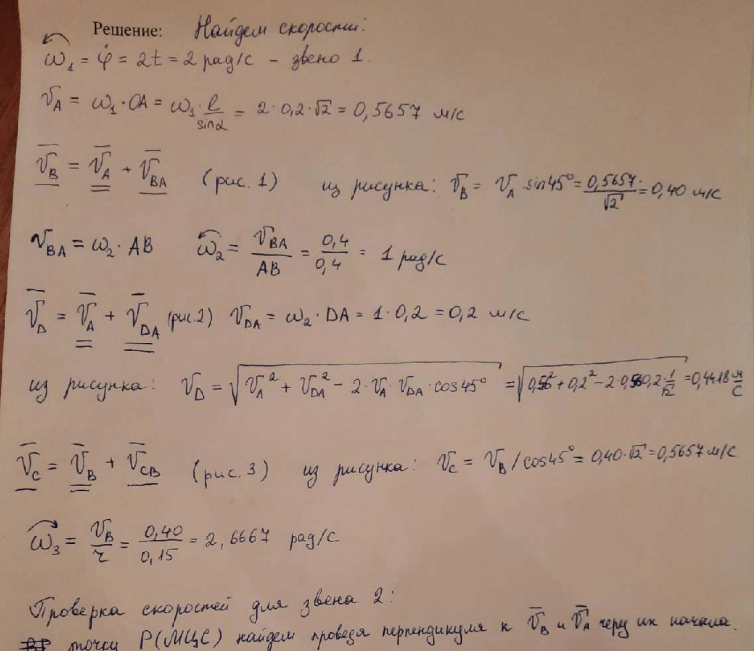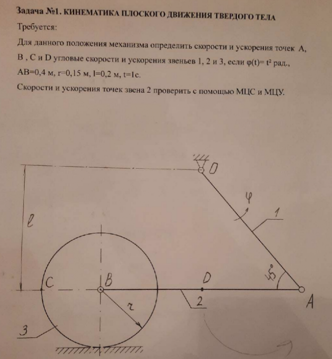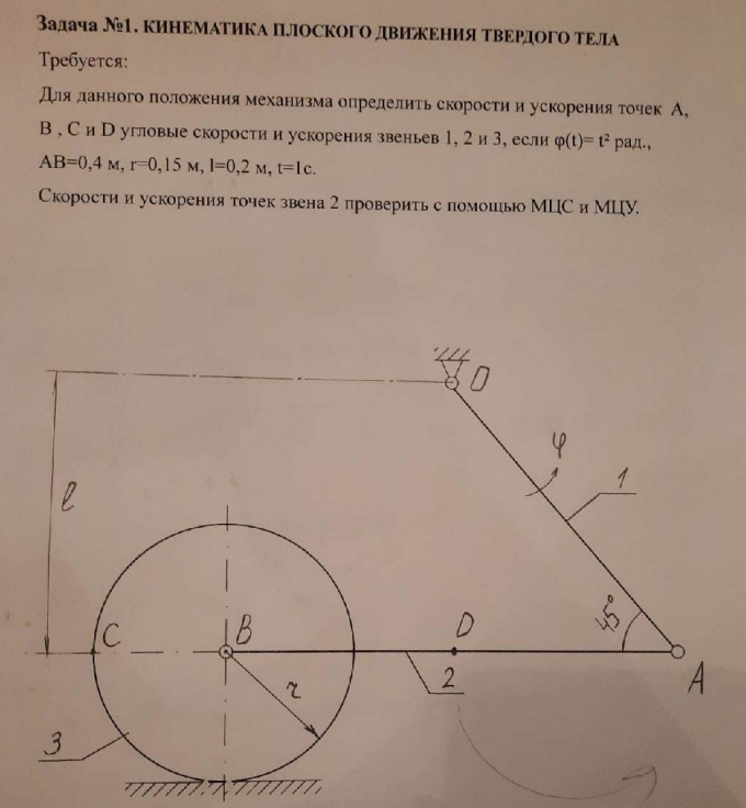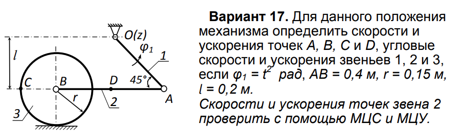 Вариант 17. Для данного положения механизма определить скорости и ускорения точек A, B, C и D, угловые скорости и ускорения звеньев 1, 2 и 3, если φ1 = t 2 рад, АВ = 0,4 м, r = 0,15 м, l = 0,2 м. Скорости и ускорения точек звена 2 проверить с помощью МЦС и МЦУ.