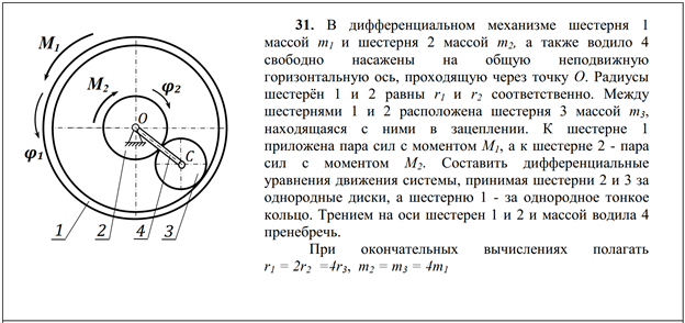 В дифференциальном механизме шестерня 1 массой m1 и шестерня 2 массой m2, а также водило 4 свободно насажены на общую неподвижную горизонтальную ось, проходящую через точку O. Радиусы шестерён 1 и 2 равны r1 и r2 соответственно. Между шестернями 1 и 2 расположена шестерня 3 массой m3, находящаяся с ними в зацеплении. К шестерне 1 приложена пара сил с моментом M1, а к шестерне 2 – пара сил с моментом M2. Составить дифференциальные уравнения движения системы, принимая шестерни 2 и 3 за однородные диски, а шестерню 1 - за однородное тонкое кольцо. Трением на оси шестерен 1 и 2 и массой водила 4 пренебречь. При окончательных вычислениях полагать r1 = 2r2 =4r3, m2 = m3 = 4m1 .