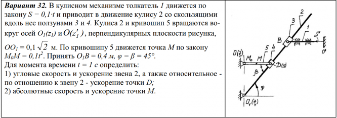 В кулисном механизме толкатель 1 движется по закону S = 0,1·t и приводит в движение кулису 2 со скользящими вдоль нее ползунами 3 и 4. Кулиса 2 и кривошип 5 вращаются вокруг осей O1(z1) иO(z\'1 ), перпендикулярных плоскости рисунка, OO1 = 0,1√2 м. По кривошипу 5 движется точка М по закону M0M = 0,1t^2. Принять О1В = 0,4 м, φ = β = 45°. Для момента времени t = 1 c определить: 1) угловые скорость и ускорение звена 2, а также относительное - по отношению к звену 2 - ускорение точки D; 2) абсолютные скорость и ускорение точки M..