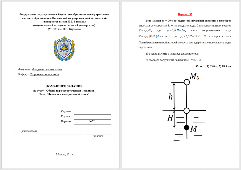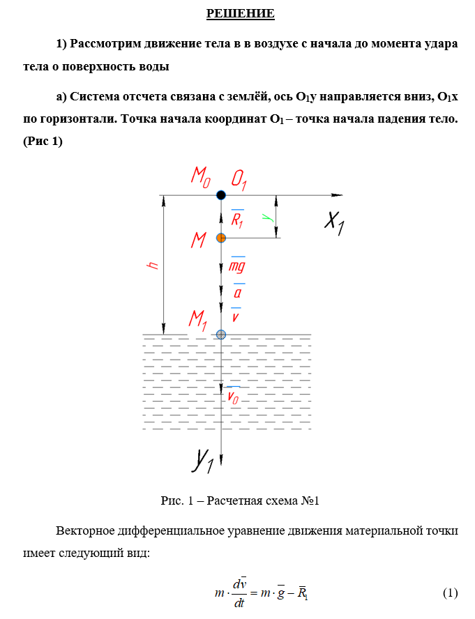 Тело массой m = 20,0 кг падает без начальной скорости с некоторой высоты и со скоростью 35,0 м/с входит в воду. Сила сопротивления воздуха , где , сила сопротивления воды где , - скорость тела. Пренебрегая некоторой потерей скорости при ударе тела о поверхность воды, определить: 1) с какой высоты h началось движение тела; 2) скорость погружения на глубине H = 20,0 м. .