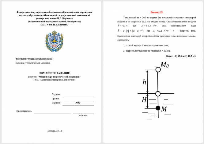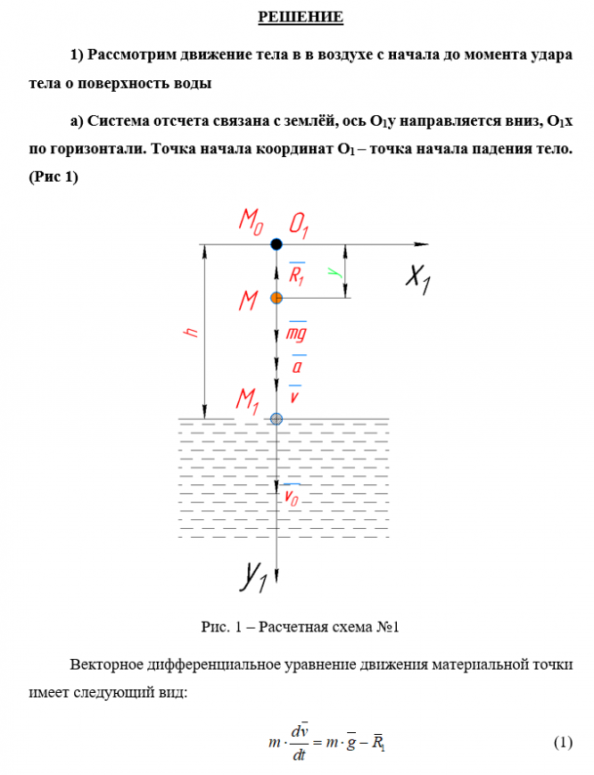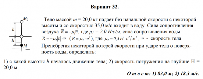 Тело массой m = 20,0 кг падает без начальной скорости с некоторой высоты и со скоростью 35,0 м/с входит в воду. Сила сопротивления воздуха , где , сила сопротивления воды где , - скорость тела. Пренебрегая некоторой потерей скорости при ударе тела о поверхность воды, определить: 1) с какой высоты h началось движение тела; 2) скорость погружения на глубине H = 20,0 м. .