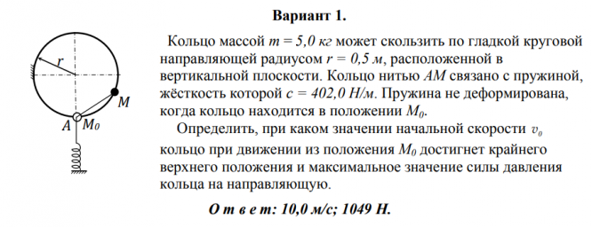 Кольцо массой m = 5,0 кг может скользить по гладкой круговой направляющей радиусом r = 0,5 м, расположенной в вертикальной плоскости. Кольцо нитью АМ связано с пружиной, жёсткость которой с = 402,0 Н/м. Пружина не деформирована, когда кольцо находится в положении М0. Определить, при каком значении начальной скорости 0 v кольцо при движении из положения М0 достигнет крайнего верхнего положения и максимальное значение силы давления кольца на направляющую.