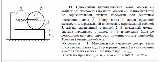13. Однородный цилиндрический каток массой m2 катится без скольжения по плите массой m1. Плита движется по горизонтальной гладкой плоскости под действием постоянной силы F . Центр катка 1 связан пружиной жёсткости c, параллельной плоскости, с вертикальной стойкой 3, жёстко скреплённой с плитой 2. В начальный момент система находилась в покое, s =0 и пружина была не деформирована (силу упругости пружины считать линейной). Трением качения пренебречь. Определить: 1) Максимальное смещение центра катка относительно плита smax; 2) ускорение плиты 2 и силу реакции в месте контакта колеса 1 и плиты 2 при s = smax. В расчетах принять: m1 = 3m2 = 30 кг, F = 100 Н, c = 2000 .