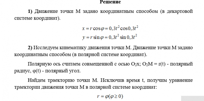 6) найти радиальные и трансверсальные составляющие скорости и ускорения точки M. Начало полярной системы координат нужно поместить в начало декартовой, направив полярную ось по оси Ox;