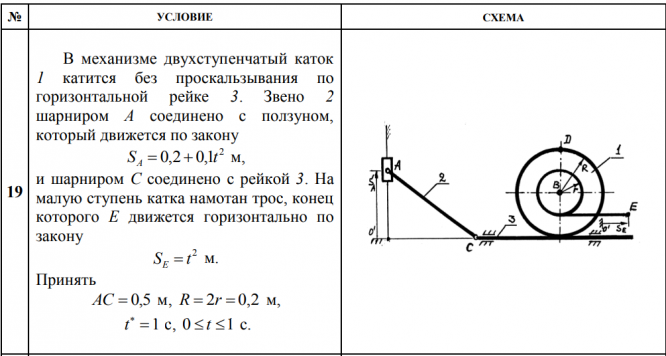 Вариант 19. В механизме двухступенчатый каток 1 катится без проскальзывания по горизонтальной рейке 3. Звено 2 шарниром А соединено с ползуном, который движется по закону 2 S 0,2 0,1t A   м, и шарниром С соединено с рейкой 3. На малую ступень катка намотан трос, конец которого Е движется горизонтально по закону 2 S t E  м. Принять AC  0,5 м, R  2r  0,2 м, 1  t с, 0  t 1 с.