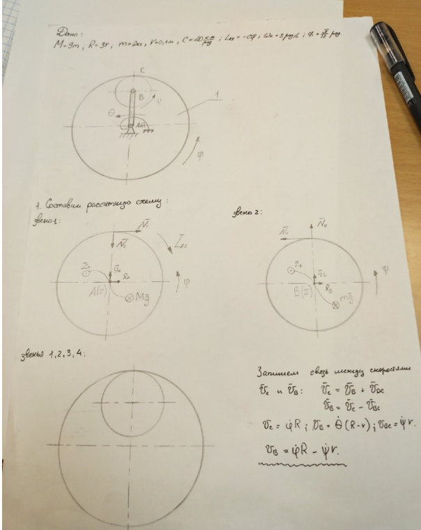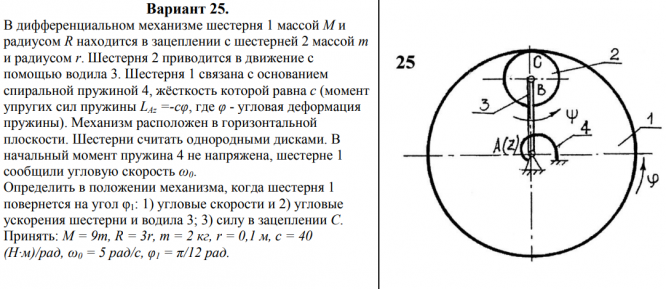 Вариант 25. В дифференциальном механизме шестерня 1 массой М и радиусом R находится в зацеплении с шестерней 2 массой m и радиусом r. Шестерня 2 приводится в движение с помощью водила 3. Шестерня 1 связана с основанием спиральной пружиной 4, жёсткость которой равна с (момент упругих сил пружины LAz =-сφ, где φ - угловая деформация пружины). Механизм расположен в горизонтальной плоскости. Шестерни считать однородными дисками. В начальный момент пружина 4 не напряжена, шестерне 1 сообщили угловую скорость ω0. Определить в положении механизма, когда шестерня 1 повернется на угол φ1: 1) угловые скорости и 2) угловые ускорения шестерни и водила 3; 3) силу в зацеплении С. Принять: М = 9m, R = 3r, m = 2 кг, r = 0,1 м, с = 40 (Н·м)/рад, ω0 = 5 рад/с, φ1 = π/12 рад.