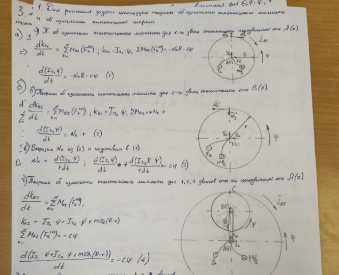 Вариант 25. В дифференциальном механизме шестерня 1 массой М и радиусом R находится в зацеплении с шестерней 2 массой m и радиусом r. Шестерня 2 приводится в движение с помощью водила 3. Шестерня 1 связана с основанием спиральной пружиной 4, жёсткость которой равна с (момент упругих сил пружины LAz =-сφ, где φ - угловая деформация пружины). Механизм расположен в горизонтальной плоскости. Шестерни считать однородными дисками. В начальный момент пружина 4 не напряжена, шестерне 1 сообщили угловую скорость ω0. Определить в положении механизма, когда шестерня 1 повернется на угол φ1: 1) угловые скорости и 2) угловые ускорения шестерни и водила 3; 3) силу в зацеплении С. Принять: М = 9m, R = 3r, m = 2 кг, r = 0,1 м, с = 40 (Н·м)/рад, ω0 = 5 рад/с, φ1 = π/12 рад.
