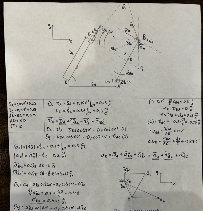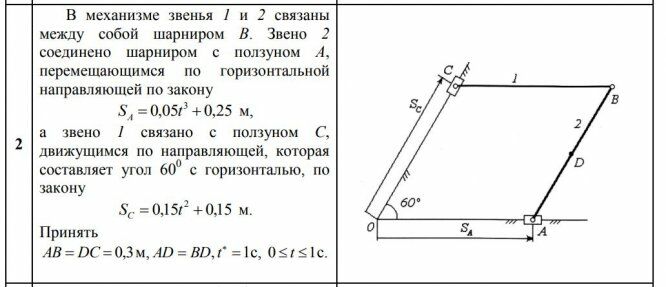 В механизме звенья 1 и 2 связаны между собой шарниром В. Звено 2 соединено шарниром с ползуном А, перемещающимся по горизонтальной направляющей по закону 0,05 0,25 3 SA t м, а звено 1 связано с ползуном С, движущимся по направляющей, которая составляет угол 600 с горизонталью, по закону 0,15 0,15 2 SC t м. Принять AB DC 0,3 м, AD BD,t 1с, 0 t 1 с.