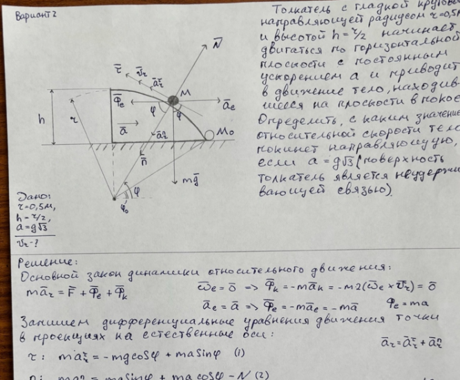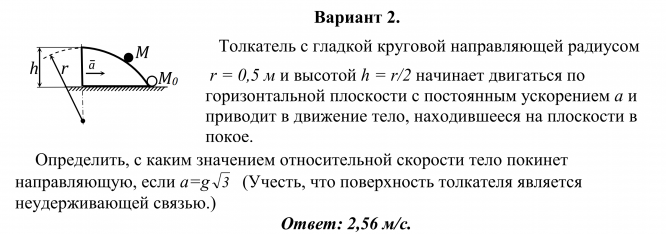 Толкатель с гладкой круговой направляющей радиусом r = 0,5 м и высотой h = r/2 начинает двигаться по горизонтальной плоскости с постоянным ускорением а и приводит в движение тело, находившееся на плоскости в покое.Определить, с каким значением относительной скорости тело покинет направляющую, если а=g 3 (Учесть, что поверхность толкателя является неудерживающей связью.)