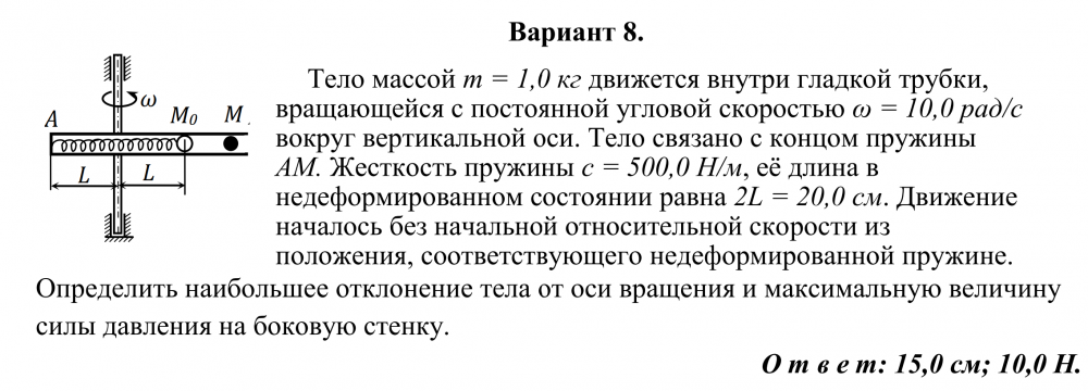 Тело массой m = 1,0 кг движется внутри гладкой трубки, вращающейся с постоянной угловой скоростью ω = 10,0 рад/с вокруг вертикальной оси. Тело связано с концом пружины АМ. Жесткость пружины с = 500,0 Н/м, её длина в недеформированном состоянии равна 2L = 20,0 см. Движение началось без начальной относительной скорости из положения, соответствующего недеформированной пружине.