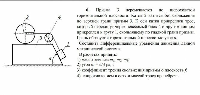 6. Призма 3 перемещается по шероховатой горизонтальной плоскости. Каток 2 катится без скольжения по верхней грани призмы 3. К оси катка прикреплен трос, который перекинут через невесомый блок 4 и другим концом прикреплен к грузу 1, скользящему по гладкой грани призмы. Грань образует с горизонтальной плоскостью угол α. Составить дифференциальные уравнения движения данной механической системы. В расчетах принять: 1) массы звеньев m1, m2, m3; 2) угол α = π/3 рад; 3) коэффициент трения скольжения призмы о плоскость f; 4) сопротивлением в осях и массой троса пренебречь.
