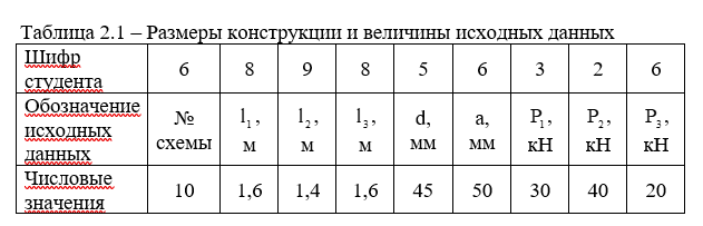 Таблица 2.1 – Размеры конструкции и величины исходных данных