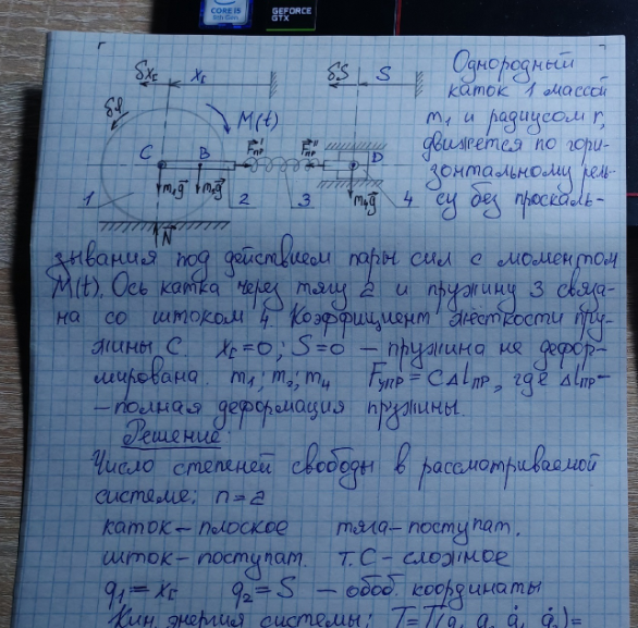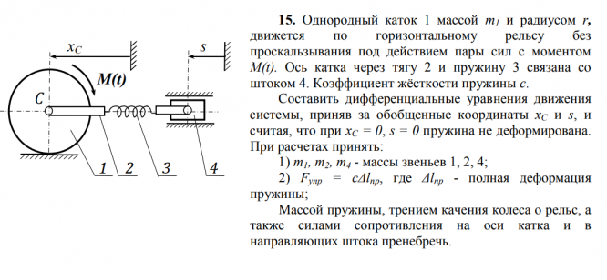 15. Однородный каток 1 массой m1 и радиусом r, движется по горизонтальному рельсу без проскальзывания под действием пары сил с моментом M(t). Ось катка через тягу 2 и пружину 3 связана со штоком 4. Коэффициент жёсткости пружины c. Составить дифференциальные уравнения движения системы, приняв за обобщенные координаты xC и s, и считая, что при xC = 0, s = 0 пружина не деформирована. При расчетах принять: 1) m1, m2, m4 - массы звеньев 1, 2, 4; 2) Fупр = cΔlпр, где Δlпр - полная деформация пружины; Массой пружины, трением качения колеса о рельс, а также силами сопротивления на оси катка и в направляющих штока пренебречь.