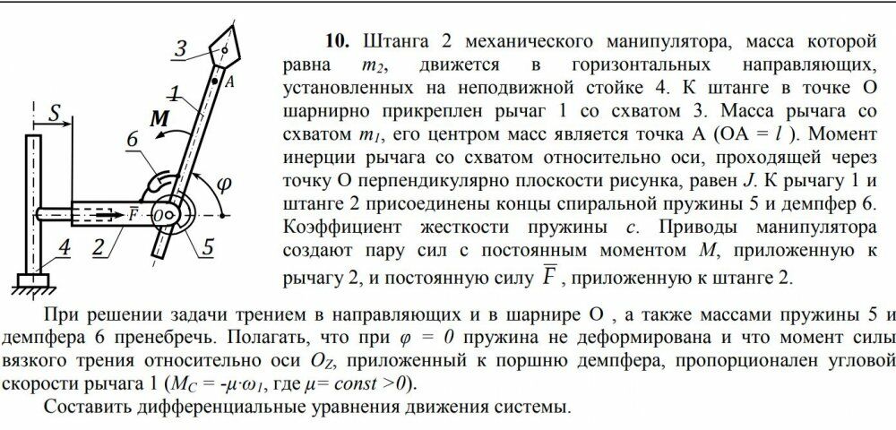 10. Штанга 2 механического манипулятора, масса которой равна m2, движется в горизонтальных направляющих, установленных на неподвижной стойке 4. К штанге в точке O шарнирно прикреплен рычаг 1 со схватом 3. Масса рычага со схватом m1, его центром масс является точка A (OA = l ). Момент инерции рычага со схватом относительно оси, проходящей через точку O перпендикулярно плоскости рисунка, равен J. К рычагу 1 и штанге 2 присоединены концы спиральной пружины 5 и демпфер 6. Коэффициент жесткости пружины с. Приводы манипулятора создают пару сил с постоянным моментом M, приложенную к рычагу 2, и постоянную силу F , приложенную к штанге 2.