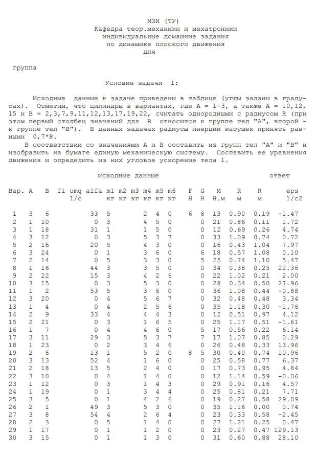 Отметим, что цилиндры в вариантах, где A = 1-3, а также A = 10,12,15 и B = 2,3,7,9,11,12,13,17,19,22, cчитать однородными c радиусом R (при этом первый столбец значений для R относится к группе тел "A", второй - к группе тел "B"). В данных задачах paдиусы инерции катушек принять равными 0,7*R.