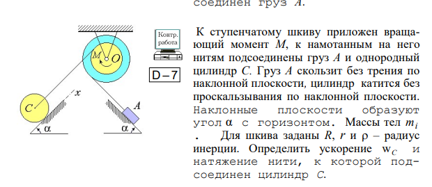 К ступенчатому шкиву приложен вращающий момент M, к намотанным на него нитям подсоединены груз A и однородный цилиндр C. Груз A скользит без трения по наклонной плоскости, цилиндр катится без проскальзывания по наклонной плоскости. Наклонные плоскости образуют угол α с горизонтом. Массы тел mi . Для шкива заданы R, r и  – радиус инерции. Определить ускорение wC и натяжение нити, к которой подсоединен цилиндр C.