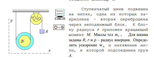 Ступенчатый шкив подвешен на нитях, одна из которых закреплена – вторая переброшена через неподвижный блок. К блоку радиуса r приложен вращающий момент M. Массы тел mi . Для шкива заданы R, r и  – радиус инерции. Определить ускорение wВ и натяжение нити, к которой подсоединен груз A.