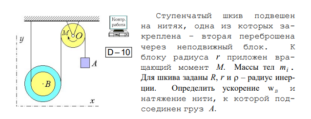 Ступенчатый шкив подвешен на нитях, одна из которых закреплена – вторая переброшена через неподвижный блок. К блоку радиуса r приложен вращающий момент M. Массы тел mi . Для шкива заданы R, r и  – радиус инерции. Определить ускорение wВ и натяжение нити, к которой подсоединен груз A.