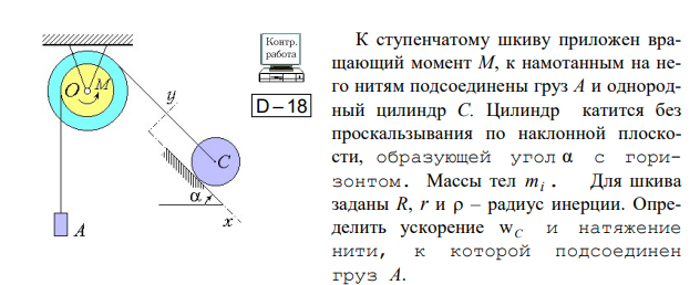 К ступенчатому шкиву приложен вращающий момент M, к намотанным на него нитям подсоединены груз A и однородный цилиндр C. Цилиндр катится без проскальзывания по наклонной плоскости, образующей угол α с горизонтом. Массы тел mi . Для шкива заданы R, r и  – радиус инерции. Определить ускорение wC и натяжение нити, к которой подсоединен груз A.