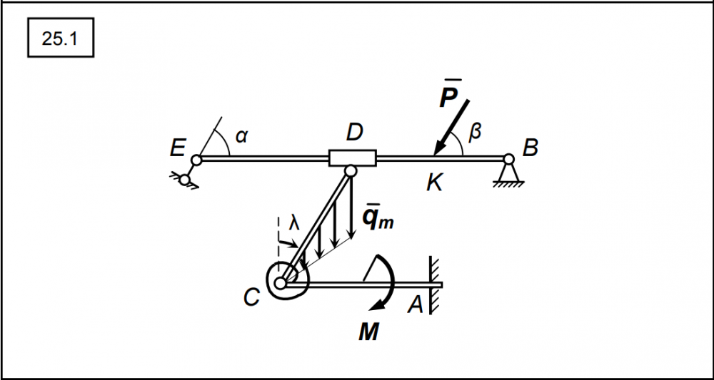 При решении задачи предполагается, что расстояние между соседними точками A, B, C, D, E, F равны l, углы α = 45°, β = 60°, R = l, r = 0,4l. Точки К и L делят соответствующие участки пополам. В вариантах, где имеются пружины, считать, что пружина предварительно закручена на угол λ = 30°, жесткость пружины Супр = Pl. Величины M = Pl, q = P/l, qm =2P/l. Определить реакции опор А и В..