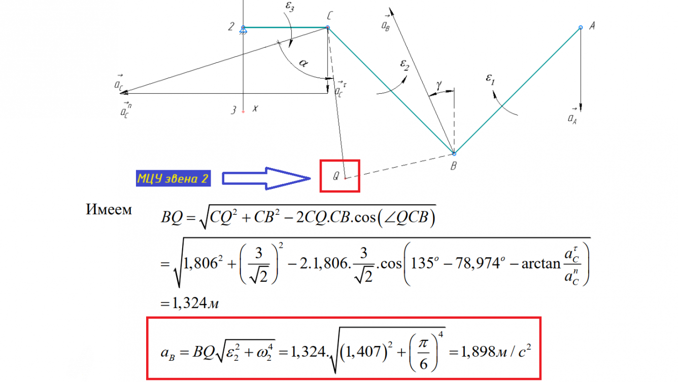 Замечания: Правильность полученных результатов скорости и ускорения точки B были проверены с помощи определения положения мгновенного центра скоростей (МЦС) звеньев механизма и мгновенного центра ускорений (МЦУ) звена 2 👌👌👌