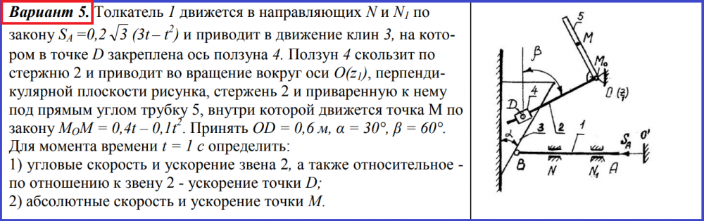 Толкатель 1 движется в направляющих N и N1 по закону SA =0,2 3 (3t – t 2 ) и приводит в движение клин 3, на котором в точке D закреплена ось ползуна 4. Ползун 4 скользит по стержню 2 и приводит во вращение вокруг оси O(z1), перпендикулярной плоскости рисунка, стержень 2 и приваренную к нему под прямым углом трубку 5, внутри которой движется точка М по закону MOM = 0,4t – 0,1t 2 . Принять OD = 0,6 м, α = 30°, β = 60°. Для момента времени t = 1 c определить: 1) угловые скорость и ускорение звена 2, а также относительное - по отношению к звену 2 - ускорение точки D; 2) абсолютные скорость и ускорение точки M..