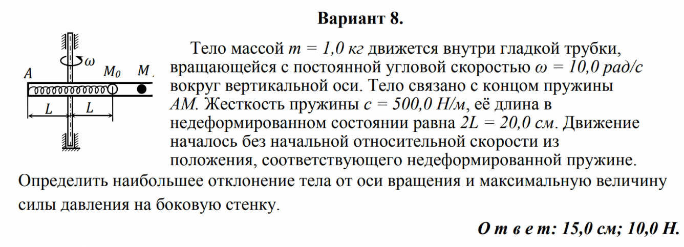 Тело массой m = 1,0 кг движется внутри гладкой трубки, вращающейся с постоянной угловой скоростью ω = 10,0 рад/с вокруг вертикальной оси. Тело связано с концом пружины АМ. Жесткость пружины с = 500,0 Н/м, её длина в недеформированном состоянии равна 2L = 20,0 см. Движение началось без начальной относительной скорости из положения, соответствующего недеформированной пружине..