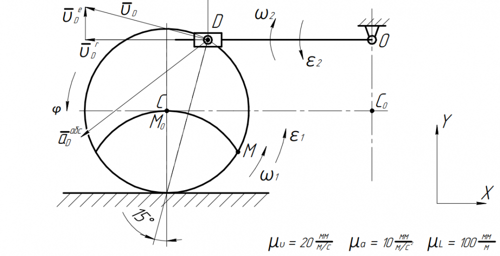 Диск 1 катится по горизонтальной направляющей без скольжения по закону φ = 2t 2 . На ободе диска в точке D шарнирно закреплён ползун 3, связанный со стержнем 2, вращающимся вокруг оси O(z1), перпендикулярной плоскости рисунка. С диском жёстко связана трубка 4, внутри которой движется точка М по закону M0M = 0,1πt. Принять α = 90°, β =30°, R = 0,3м, С0 - положение центра катка при t = 0 с. Для момента времени t = 1 c определить: 1) угловые скорость и ускорение звена 2 и относительное ускорение точки D по отношению к звену 2; 2) абсолютные скорость и ускорение точки M..