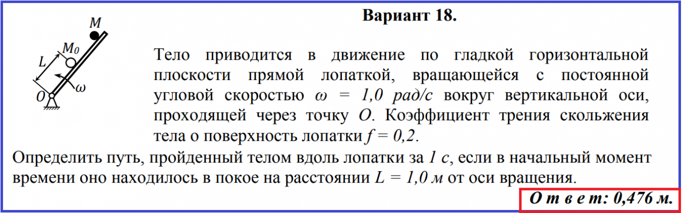 Тело приводится в движение по гладкой горизонтальной плоскости прямой лопаткой, вращающейся с постоянной угловой скоростью ω = 1,0 рад/с вокруг вертикальной оси, проходящей через точку O. Коэффициент трения скольжения тела о поверхность лопатки f = 0,2. Определить путь, пройденный телом вдоль лопатки за 1 с, если в начальный момент времени оно находилось в покое на расстоянии L = 1,0 м от оси вращения. .
