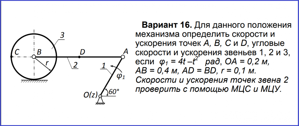 Вариант 16. Для данного положения механизма определить скорости и ускорения точек A, B, C и D, угловые скорости и ускорения звеньев 1, 2 и 3, если φ1 = 4t –t 2 рад, ОА = 0,2 м, АВ = 0,4 м, AD = BD, r = 0,1 м. Скорости и ускорения точек звена 2 проверить с помощью МЦС и МЦУ..