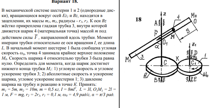В механической системе шестерни 1 и 2 (однородные диски), вращающиеся вокруг осей Ez1 и Bz, находятся в зацеплении, их массы m1, m2, радиусы - r1, r2. К оси Вz жёстко прикреплена гладкая трубка 3, внутри которой движется шарик 4 (материальная точка) массой m под действием силы F , направленной вдоль трубки. Момент инерции трубки относительно ее оси вращения I, ее длина L. В начальный момент шестерне 1 была сообщена угловая скорость ω0, точка 4 занимала крайнее верхнее положение М0. Скорость шарика 4 относительно трубки 3 была равна нулю. Определить для момента, когда шарик достигнет нижнего конца трубки М1: 1) угловую скорость и угловое ускорение трубки 3; 2) абсолютные скорость и ускорение шарика, угловое ускорение шестерни 1; 3) давление шарика на трубку и реакцию в точке К. Принять: m1 = 5m, m2 = 10m, m = 0,5 кг, I = 8ml2 , L = 3l, O1M1 = 2l = 1 м, F = mg, r2 = 2r1, r1 = 0,1 м, ω0 = 4,9 рад/с, α = π/3 рад.