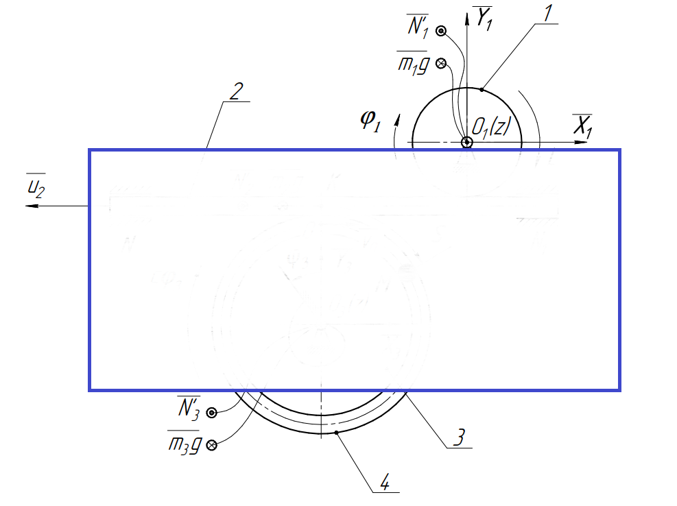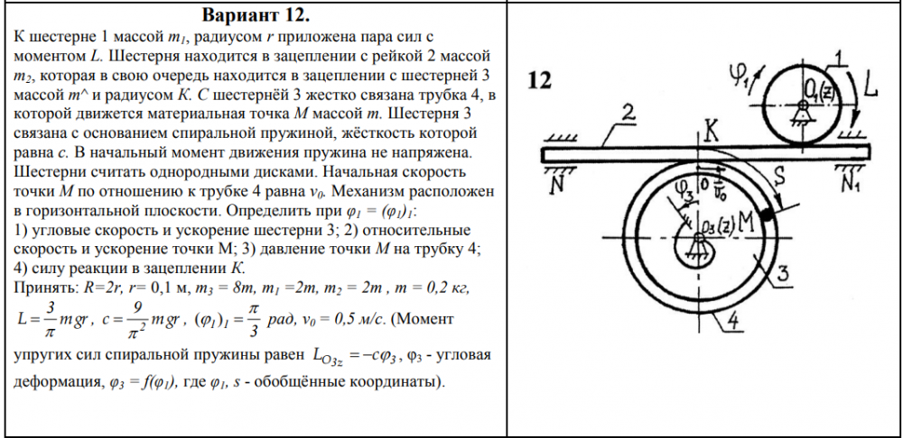К шестерне 1 массой m1, радиусом r приложена пара сил с моментом L. Шестерня находится в зацеплении с рейкой 2 массой m2, которая в свою очередь находится в зацеплении с шестерней 3 массой m и радиусом К. С шестернёй 3 жестко связана трубка 4, в которой движется материальная точка М массой m. Шестерня 3 связана с основанием спиральной пружиной, жёсткость которой равна с. В начальный момент движения пружина не напряжена. Шестерни считать однородными дисками. Начальная скорость точки М по отношению к трубке 4 равна v0. Механизм расположен в горизонтальной плоскости. Определить при φ1 = (φ1)1: 1) угловые скорость и ускорение шестерни 3; 2) относительные скорость и ускорение точки М; 3) давление точки М на трубку 4; 4) силу реакции в зацеплении К.