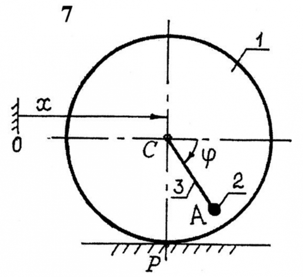 Каток 1 (однородный диск) массой т1 катится без скольжения по горизонтальной направляющей. В центре катка С шарнирно закреплен маятник CA длиной l. Масса маятника сосредоточена в точке А и равна т2. В начальный момент стержень 3 находился в горизонтальном положении (φ =0), система покоилась. При φ = φ1 определить: 1) скорость и ускорение центра С катка 1; 2) абсолютные скорость и ускорение точки А; 3) реакцию шарнира С; 4) реакцию в точке Р. Принять т1 = 4т2 = 4т, mg =100 Н, l = 0,2 м, φ1 =π/4 рад.