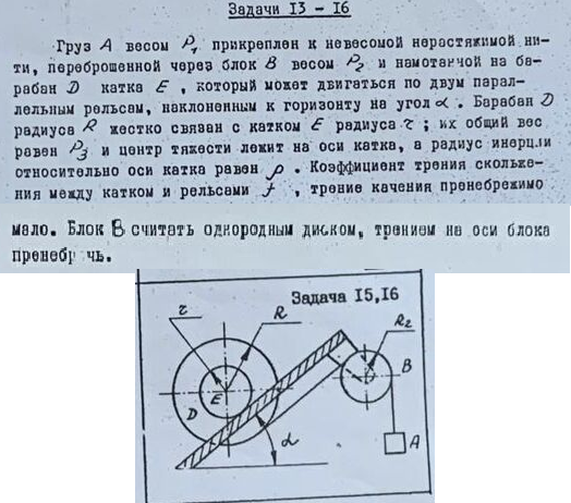Груз А весом Р, прикреплен к невесомой нерастяжимой нити, переброшенной через блок В весом Р2 и намотанчой на барабан D катка Е , который может двигаться по двум параллельным рельсам, наклоненным к горизонту на угол α . Барабан D радиуса R жестко связан с катком Е радиуса r; их общий вес равен Р3 и центр тякести лежит на оси катка, а радиус инерции относительно оси катка равен ρ. Коэффициент трения сколькения между катком и рельсами f, трение качения пренебрежимо мало. Блок В считать однородным диском, трением на оси блока пренебречь. Предполагая, что системы начинают двикение из состояния покоя, необходино найти: 1. Уравнения движения катка Е. 2. Давление на ось блока В.