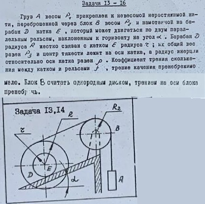 Груз А весом Р, прикреплен к невесомой нерастяжимой нити, переброшенной через блок В весом Р2 и намотанчой на барабан D катка Е , который может двигаться по двум параллельным рельсам, наклоненным к горизонту на угол α . Барабан D радиуса R жестко связан с катком Е радиуса r; их общий вес равен Р3 и центр тякести лежит на оси катка, а радиус инерции относительно оси катка равен ρ. Коэффициент трения сколькения между катком и рельсами f, трение качения пренебрежимо мало. Блок В считать однородным диском, трением на оси блока пренебречь. Предполагая, что системы начинают двикение из состояния покоя, необходино найти: 1. Уравнения движения катка Е. 2. Давление на ось блока В.