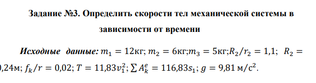 Задание №3. Определить скорости тел механической системы в зависимости от времени Исходные данные: 𝑚1 = 12кг; 𝑚2 = 6кг;𝑚3 = 5кг;𝑅2⁄𝑟2 = 1,1; 𝑅2 = 0,24м; 𝑓𝑘⁄𝑟 = 0,02; 𝑇 = 11,83𝑣1 2 ; ∑ 𝐴𝑘 𝑒 = 116,83𝑠1; 𝑔 = 9,81 м с 2