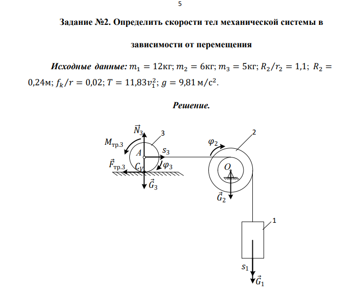 Задание №2. Определить скорости тел механической системы в зависимости от перемещения Исходные данные: 𝑚1 = 12кг; 𝑚2 = 6кг; 𝑚3 = 5кг; 𝑅2⁄𝑟2 = 1,1; 𝑅2 = 0,24м; 𝑓𝑘⁄𝑟 = 0,02; 𝑇 = 11,83𝑣1 2 ; 𝑔 = 9,81м с 2 ⁄ .