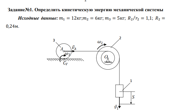 Задание№1. Определить кинетическую энергию механической системы Исходные данные: 𝑚1 = 12кг;𝑚2 = 6кг; 𝑚3 = 5кг; 𝑅2⁄𝑟2 = 1,1; 𝑅2 = 0,24м.