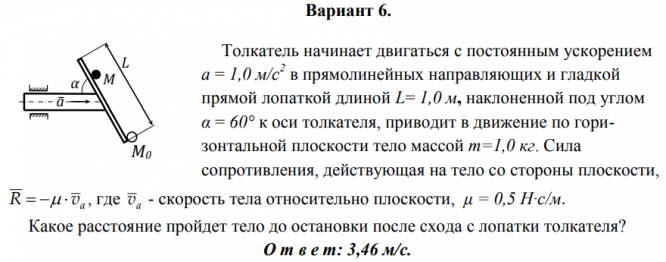 Толкатель начинает двигаться с постоянным ускорением а = 1,0 м/с2 в прямолинейных направляющих и гладкой прямой лопаткой длиной L= 1,0 м, наклоненной под углом α = 60° к оси толкателя, приводит в движение по горизонтальной плоскости тело массой т=1,0 кг. Сила сопротивления, действующая на тело со стороны плоскости, R va , где a v - скорость тела относительно плоскости, μ = 0,5 Н·с/м. Какое расстояние пройдет тело до остановки после схода с лопатки толкателя?.