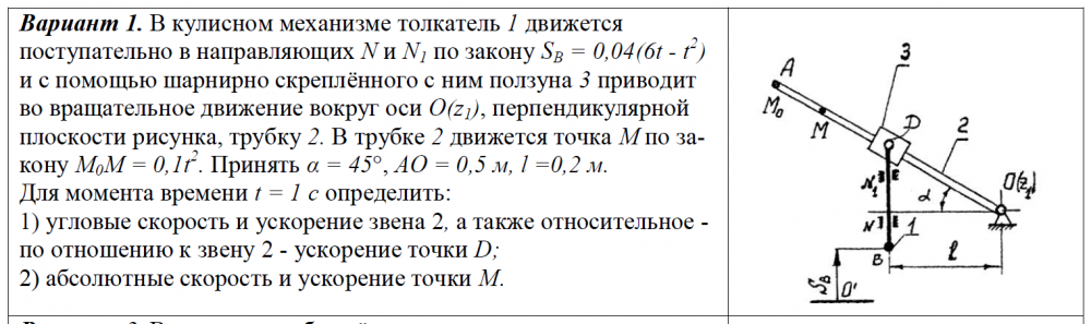 Вариант 1. В кулисном механизме толкатель 1 движется поступательно в направляющих N и N1 по закону SB = 0,04(6t - t 2 ) и с помощью шарнирно скреплённого с ним ползуна 3 приводит во вращательное движение вокруг оси O(z1), перпендикулярной плоскости рисунка, трубку 2. В трубке 2 движется точка М по закону М0М = 0,1t 2 . Принять α = 45°, АО = 0,5 м, l =0,2 м. Для момента времени t = 1 c определить: 1) угловые скорость и ускорение звена 2, а также относительное - по отношению к звену 2 - ускорение точки D; 2) абсолютные скорость и ускорение точки M. .